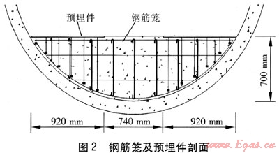由隧道接收井處向始發(fā)井處進(jìn)行澆筑。當(dāng)混凝土運輸車行駛到待澆筑位置時,啟動傳送帶上的電機(jī),打開料斗桶下方的活動擋板,混凝土依靠自重下落到傳送帶上,輸送至待澆筑位置?;炷翝仓r,為保證施工的順利進(jìn)行,需在待澆筑混凝土的正上方設(shè)置鋼支架跳板,跳板需距離混凝土成型面有一定的距離,以保證混凝土正常成型。隧道內(nèi)的混凝土運輸時間較長,利用混凝土運輸?shù)臅r間進(jìn)行軌道拆除。軌道每段長6m,將拆除的軌道吊掛在隧道壁上。在澆筑混凝土過程中,將預(yù)制好的鋼筋籠和預(yù)埋件安裝好,保證預(yù)埋件上表面水平,且和墊層處于同一水平面,澆筑時要嚴(yán)格按照施工規(guī)范進(jìn)行振搗?;炷翝仓瓿桑谑諠{后應(yīng)進(jìn)行養(yǎng)護(hù)。養(yǎng)護(hù)期間覆蓋保溫,并保持濕潤,覆蓋時注意不得損傷和污染混凝土表面。在混凝土上面漫鋪草袋,進(jìn)行灑水養(yǎng)護(hù)[2]。鋼筋籠及預(yù)埋件剖面見圖2。