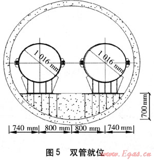 某工程盾構(gòu)隧道長1400m,隧道斷面為圓形,內(nèi)徑為3.08m,始發(fā)井為直徑為12m、深25m的圓柱形豎井,接收井為直徑為12m、深15m的圓柱形豎井。根據(jù)設(shè)計要求,圓柱形隧道底部澆筑高700mm的混凝土墊層,墊層上并行敷設(shè)兩條外徑為1016mm的管道。管道全部安裝在滑動支架上,每隔12m設(shè)置1個滑動支架,滑動支架滿足承重和抗浮的要求。