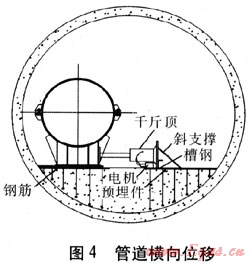 隧道內(nèi)左側(cè)管道焊接完成300m,并且防腐補(bǔ)口完成并合格后,從管道端頭開始橫向位移,管道位移與焊接、補(bǔ)口、補(bǔ)傷同步進(jìn)行。為保證前方作業(yè)人員的安全,制作管道橫向支撐架,支撐在補(bǔ)口、補(bǔ)傷及焊接作業(yè)人員附近。由于管道支架安裝時已經(jīng)在其下方縱向設(shè)置了直徑為10mm的鋼筋,利用推力為500kN的電動千斤頂,并在右側(cè)管道的預(yù)埋件上焊接相應(yīng)的槽鋼或厚鋼板作為千斤頂?shù)牡撞恐吸c,千斤頂前方頂住管道支架立板,對左側(cè)管道進(jìn)行整體橫向位移。移動時應(yīng)盡量使管道靠近隧道內(nèi)壁,同時保證管道支架下的鋼筋不脫離支架底板,以免影響位移后的管道就位。每次位移完成后都要將右側(cè)管道預(yù)埋件上的臨時支撐拆除,并利用角磨機(jī)將焊渣等雜物清除干凈。由于管道較長,必須從管道一端逐步進(jìn)行位移。根據(jù)管道直徑及重量,一般采取每根鋼管設(shè)置一個位移點,即按順序?qū)⒐艿乐Ъ茉O(shè)置為位移點,可同時設(shè)置4個位移點。設(shè)置以300m為1個基本段,對管道進(jìn)行位移,并且保證位移處和前方施工人員始終保持300m距離,完成300m管道位移需移動6次。為防止管道滾動,在位移后的管道支架下方打入三角木楔。每300m管道位移后,在剩余空間敷設(shè)軌道,軌道敷設(shè)時應(yīng)盡量遠(yuǎn)離左側(cè)管道,避免對右側(cè)管道運輸造成影響。依次往后,直至把整條管道位移至靠近隧道內(nèi)壁。管道橫向位移見圖4。