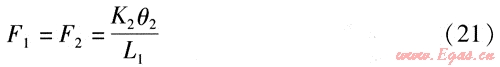 鉸鏈波紋管補(bǔ)償器具有較高強(qiáng)度,可以傳遞荷載,并由于自身構(gòu)件承受管道介質(zhì)的內(nèi)壓推力(盲板力),作用在固定支座上的力很小,方便了管道系統(tǒng)的設(shè)計(jì)以及固定支座的設(shè)計(jì)與施工。6種典型管系中固定支座的受力分析見圖1~6,F(xiàn)1、F2為鉸鏈波紋管補(bǔ)償器作用在固定支座上的力,單位為N。6種典型管系中鉸鏈波紋管補(bǔ)償器工作時(shí)作用在固定支座上力的計(jì)算如下。