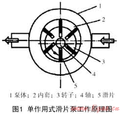 單作用式滑片泵的工作原理如圖1所示[4]。主要由泵體1、內(nèi)套2、轉(zhuǎn)子3、軸4、滑片5、側(cè)板6(未示出)等零件組成。內(nèi)套與轉(zhuǎn)子之間有偏心距e,滑片安放在轉(zhuǎn)子槽內(nèi),可沿槽滑動(dòng),當(dāng)轉(zhuǎn)子回轉(zhuǎn)時(shí),滑片靠自身的離心力緊貼內(nèi)套內(nèi)壁,由內(nèi)套內(nèi)表面、轉(zhuǎn)子外表面、滑片及兩側(cè)板端面之間形成若干個(gè)封閉工作室,當(dāng)轉(zhuǎn)子逆時(shí)針回轉(zhuǎn)時(shí),右邊的滑片逐漸伸出,相鄰兩滑片間容積逐漸增大,形成局部真空,液體由吸入口進(jìn)入工作室,這是泵的吸入過程。左邊的滑片被內(nèi)套逐漸壓入槽內(nèi),相鄰兩滑片間封閉容積逐漸減小,將液體壓出排除口,這是泵的壓出過程。轉(zhuǎn)子轉(zhuǎn)一周,完成一次吸入壓出。在泵的吸入腔和壓出腔之間,有一段封油區(qū),把吸入腔和壓出腔隔開。泵的排量Q與偏心距e、泵的轉(zhuǎn)速n成正比,因此,可采用改變偏心距和轉(zhuǎn)速的辦法調(diào)節(jié)排量或制成系列產(chǎn)品,滿足不同工況的需要。