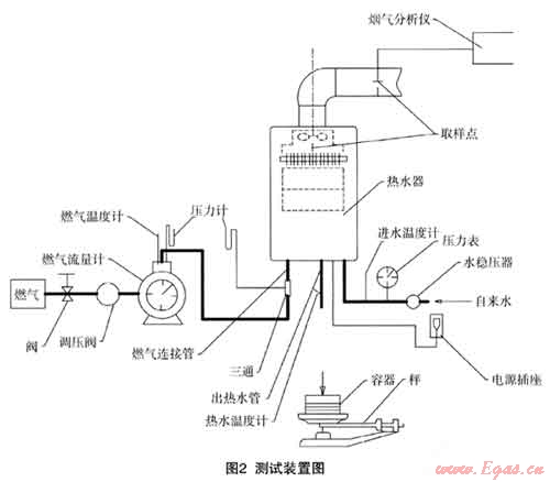 (1) 選定待測熱水器,進(jìn)行安裝,凋試。對于非恒溫機,將燃?xì)忾y門開至最大,調(diào)節(jié)出水溫度比進(jìn)水溫度高40±1℃,當(dāng)不能調(diào)節(jié)至此溫度時,在熱水器溫度可調(diào)范圍內(nèi),淵節(jié)至最接近的溫度。對于恒溫機,將溫度設(shè)定在最高狀態(tài),適當(dāng)提高進(jìn)水樂力,使熱水器在最大負(fù)荷狀態(tài)下工作;