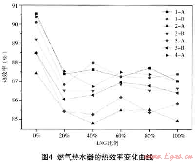 (3) 熱效率不是互換性指標(biāo)。但是除了3-A和3-B以外,幾乎所有熱水器在試驗氣下熱效率均不達(dá)標(biāo),這一點應(yīng)加以重視;