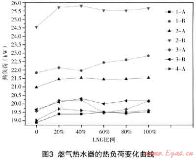 圖3為LNG比例對熱水器熱負(fù)荷的影響。熱水器的熱負(fù)荷隨著LNG比例的增加呈現(xiàn)增大的趨勢,其變化規(guī)律隨著熱水器結(jié)構(gòu)型式與品牌的不同而不同。