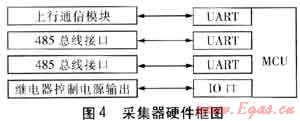 采集器的任務(wù)就是轉(zhuǎn)發(fā)集中器和燃?xì)獗碇g的通信數(shù)據(jù),并在抄讀燃?xì)獗淼臅r(shí)候短暫地給燃?xì)獗淼碾娮硬糠止╇姟2杉骱图衅髦g的通信采用了電力線載波通信方式。電力線載波通信有通信不穩(wěn)定、易受干擾的缺點(diǎn),但采集器只要在軟件上做些改進(jìn)就能極大地彌補(bǔ)這一缺點(diǎn),例如能短時(shí)間地儲(chǔ)存燃?xì)獗淼臄?shù)據(jù)。這樣當(dāng)給集中器返回的燃?xì)獗頂?shù)據(jù)因信道不穩(wěn)定而丟失時(shí),集中器再次下發(fā)抄這塊表的數(shù)據(jù)時(shí),采集器就不用再去抄燃?xì)獗砹?,而是很快地直接返回采集器?chǔ)存的數(shù)據(jù),這樣就使抄表成功率大大提高。采集器也要求采用可更換的通信模塊,儲(chǔ)存容量不需要太大,采集器MCU要有至少3個(gè)UART,還要有給燃?xì)獗砉╇妴卧?。采集器的硬件框圖見(jiàn)圖4。MCU的1個(gè)UART和上行通信模塊相連,2個(gè)UART設(shè)計(jì)成RS485總線。這2個(gè)RS485接口,1個(gè)是和燃?xì)獗硗ㄐ庞茫?個(gè)保留和集中器通信。如果采集器和集中器距離很近,就用保留的RS485接口直接和集中器相連。同時(shí)MCU控制1個(gè)繼電器給直讀式燃?xì)獗淼碾娮硬糠止╇姟?/span>