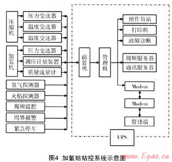 站控制系統(tǒng)采用分布、分級(jí)的控制方式,分散控制、集中管理,整個(gè)加氫站的站控系統(tǒng)由兩級(jí)計(jì)算機(jī)組成。前置機(jī)(下位機(jī))負(fù)責(zé)實(shí)時(shí)數(shù)據(jù)的采集功能;管理機(jī)(上位機(jī))用于完成數(shù)據(jù)信號(hào)接受處理、顯示、記錄、控制和數(shù)據(jù)上傳。在控制室集中顯示加氫站內(nèi)所有檢測(cè)儀表、閥門(mén)狀態(tài)、可燃?xì)怏w檢測(cè)等信號(hào)的監(jiān)測(cè),以及對(duì)閥門(mén)實(shí)現(xiàn)自動(dòng)控制。站控系統(tǒng)可監(jiān)視、控制整個(gè)加氫站運(yùn)行的全過(guò)程,計(jì)算所需的技術(shù)參數(shù),自動(dòng)繪制參數(shù)的實(shí)時(shí)和歷史趨勢(shì)曲線(xiàn)。對(duì)站區(qū)采集的數(shù)據(jù)包括卸氣系統(tǒng)、增壓系統(tǒng)、儲(chǔ)氫系統(tǒng)、可燃?xì)怏w檢測(cè)系統(tǒng)、火焰探測(cè)系統(tǒng)、視頻監(jiān)控系統(tǒng)及加氣系統(tǒng)等所有數(shù)據(jù)。