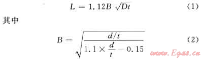 當(dāng)腐蝕深度比大于管道壁厚的10%且小于80%的鄰近腐蝕區(qū)域,腐蝕區(qū)的軸向長度不得大于由下式計算出的距離: