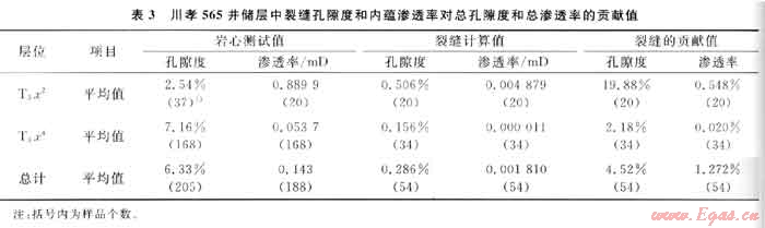 據(jù)川孝565井須二、須四段巖心孔隙度和滲透率的分析結(jié)果,可估算裂縫孔隙度和內(nèi)蘊(yùn)滲透率對(duì)總孔隙度和總滲透率的貢獻(xiàn)值(表3)。