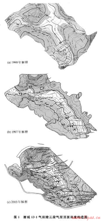 表1是1990年、1997年和2003年解釋的陵三段氣層頂(T62)、底(T70)構(gòu)造要素對比表。這幾次解釋的構(gòu)造走向均為北西 南東向(圖1),然而解釋的氣層頂面構(gòu)造圈閉面積、構(gòu)造幅度和最低圈閉線均有一定程度的變化,但在BP01資料基礎(chǔ)上研究得到的構(gòu)造圖在實鉆井深度、橫向壓力變化和氣水界面等方面均與實際資料最為吻合。