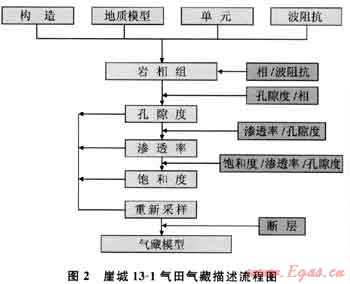 這次氣藏描述通過使用多步驟、復(fù)合地質(zhì)統(tǒng)計模擬技術(shù),構(gòu)建了多個具有同等概率分布的巖相組、孔隙度和滲透率模型,圖2是崖城13-1氣田氣藏描述流程。巖相組模式是這個流程的基本模型,它是以巖心的巖相描述資料為基礎(chǔ),用三維地震波阻抗體進(jìn)行外推,應(yīng)用分類變量條件序貫指示模擬方法(SISIMPDFP)來構(gòu)建的,模擬的實現(xiàn)與實際的鉆井資料和地質(zhì)模型保持一致。在這個模型的基礎(chǔ)上,選擇巖相組模型和特定巖相組的孔隙度統(tǒng)計結(jié)果,使用序貫高斯模擬方法(SGSIM)估算孔隙度值。滲透率的分布則根據(jù)不同的巖相組、孔隙度以及用井資料確立的孔-滲關(guān)系,利用序貫高斯協(xié)模擬(SGCOSIM)來確定。