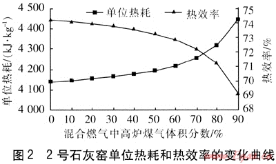 ① 混合燃氣的組成影響石灰窯熱效率和單位熱耗,石灰窯的熱工計算表明,混合燃氣中高爐煤氣體積分數(shù)從0上升到90%時,石灰窯的熱效率由74.18%降低到69.10%,而石灰窯的單位熱耗從4139kJ/kg升高到4444kJ/kg。