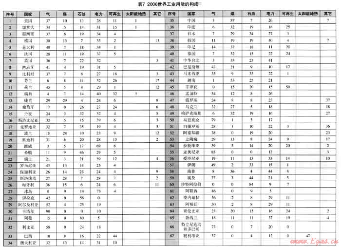 當(dāng)今我國(guó)研究節(jié)能、減排的許多文獻(xiàn)中均常出現(xiàn)以我國(guó)單位GDP的能耗與國(guó)外特別是發(fā)達(dá)國(guó)家的情況相比較,得出的結(jié)論是“差距很大,因而可挖的潛力也很大”,克服差距的手段是“科技進(jìn)步”,采用的方法是關(guān)停產(chǎn)能落后的企業(yè)。,實(shí)際上節(jié)能減排不僅與科技進(jìn)步有關(guān),也與一個(gè)國(guó)家的能源構(gòu)成有關(guān)。不同能源構(gòu)成國(guó)家的節(jié)能減排在宏觀上存在許多不可比性,應(yīng)有實(shí)事求是的分析。為此,本文根據(jù)國(guó)際燃?xì)饴?lián)盟多年公布的研究資料,做一些分析探討,從本世紀(jì)以來世界的能源構(gòu)成開始。