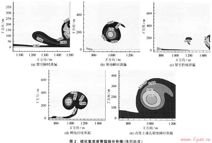 1) 氣體泄漏速度分布:X方向(水平方向)埋地管道泄漏(工況B、D、E)速度比架空管道(工況A、C)稍大,存在左偏的逆流區(qū);持續(xù)泄漏(工況C、D)速度等值線比架空瞬間右偏;埋地持續(xù)泄漏在左上和右下方存在2個速度較大區(qū);增大土壤孔隙度時,速度等值線左偏。Y方向(豎直方向)瞬間泄漏(工況A、B、E)速度在左側(cè)存在逆流區(qū);埋地管道泄漏0速度線向左偏移;土壤孔隙度增大時,等值線向左偏移;持續(xù)泄漏等值線呈近橢圓分布,不存在逆流區(qū)。