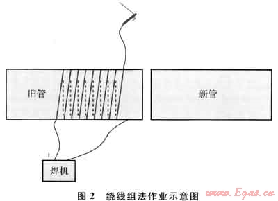 用直流電焊機的手焊鉗線在帶磁管道上順時針或反時針纏繞若干圈,纏繞匝數(shù)根據(jù)管道的磁場強弱決定,一般選用8~10圈為宜,其作業(yè)示意圖如圖2所示。繞線時如發(fā)現(xiàn)管口磁性變大,則需全部拆除,重新反向纏繞。