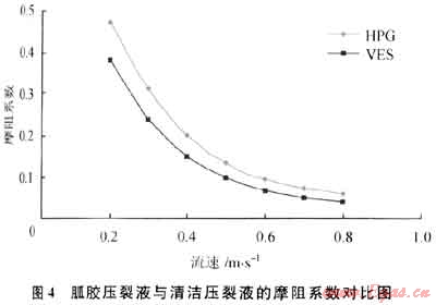 這種新型的溶液的結(jié)構(gòu)具有良好的可逆性,當(dāng)高剪切時(shí),結(jié)構(gòu)解體;剪切速率降低后,結(jié)構(gòu)又重新恢復(fù)。采用自研環(huán)路實(shí)驗(yàn)裝置測定的流動摩阻如圖4所示:在同等條件下VES壓裂液摩阻系數(shù)比胍膠壓裂液低,有利于降低施工摩阻減小施工壓力。