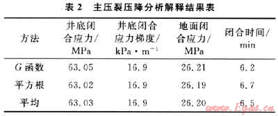 對主壓裂分別進(jìn)行停泵壓力分析、壓降G函數(shù)分析和壓降雙對數(shù)分析以及平方根分析,井底閉合應(yīng)力梯度為16.9kPa/m,地面閉合壓力為26.2MPa,閉合時(shí)間為6.5min(表2)。