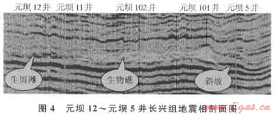 元壩地區(qū)長(zhǎng)興組某方向的地震剖面(圖4)顯示地震相特征主要表現(xiàn)為臺(tái)地邊緣淺灘相、臺(tái)地邊緣生物礁相及礁前斜坡相,與測(cè)井相所反映的沉積特征一致。臺(tái)地邊緣生物礁為“低頻、弱振幅、內(nèi)部雜亂、透鏡狀反射結(jié)構(gòu)”地震相特征[7],一般外形上頂部上拱隆起形成披蓋構(gòu)造和側(cè)面上超形態(tài),呈丘狀,這與臺(tái)地邊緣生物礁沉積體的“含弱反射的隆起”特征類似,為典型生物礁沉積特征,如元壩102、元壩101井區(qū)地震相沉積特征。臺(tái)地邊緣淺灘,常發(fā)育碎屑灘,這些碎屑顆粒往往是由海浪拍打生物礁形成的,地震剖面上呈“斷續(xù)、斜交、中強(qiáng)振幅反射”的地震相特征,如元壩12、元壩11井井區(qū)為礁后淺灘沉積特征。臺(tái)地邊緣往陸棚過(guò)渡,水動(dòng)力條件逐漸減弱,巖性泥質(zhì)含量增多,反射波組呈平行、亞平行反射,并有同相軸增多現(xiàn)象,如元壩5井井區(qū)為礁前斜坡沉積特征。