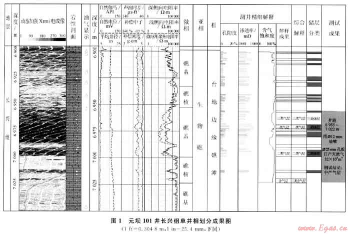 在區(qū)域地質(zhì)背景分析的基礎(chǔ)上,綜合利用成像測(cè)井、常規(guī)測(cè)井及巖屑薄片鑒定等資料,結(jié)合實(shí)際鉆探成果進(jìn)行了研究區(qū)長(zhǎng)興組的單井相劃分。以元壩101井單井相劃分為例(圖1),圖中顯示該段地層自然伽馬低值,約10API,巖性純,以淺灰色白云巖、溶孔白云巖及生屑灰?guī)r為主,夾有云質(zhì)灰?guī)r和含云灰?guī)r;成像圖像上可見(jiàn)6900~6925m和6950~7000m裂縫及溶蝕孔洞非常發(fā)育,對(duì)應(yīng)的孔隙度曲線明顯增大,儲(chǔ)集物性好,電阻率曲線較致密圍巖明顯降低,呈大幅度正差異特征,儲(chǔ)層滲透性好。這些特征反映當(dāng)時(shí)的沉積水體相對(duì)較淺,沉積水體能量較強(qiáng),白云巖化作用較強(qiáng),易形成溶蝕孔洞白云巖儲(chǔ)層,為臺(tái)地邊緣生物礁儲(chǔ)層沉積特征。取心資料顯示,該井段含有大量生物碎屑,這些生屑多為有孔蟲(chóng)類、腕足類及鰱的化石,而這些生物正是區(qū)域上長(zhǎng)興組沉積時(shí)期生物礁的附礁生物[2];結(jié)合研究區(qū)所有單井的長(zhǎng)興組沉積相分析結(jié)果,綜合認(rèn)為該地層屬于臺(tái)地邊緣礁灘相沉積。