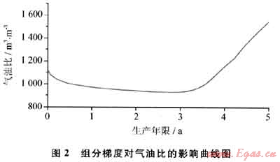 2) 由于組分梯度的存在,若為了避水在儲層上部進(jìn)行射孔,會導(dǎo)致氣井的生產(chǎn)氣油比下降。