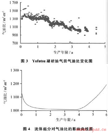 某些凝析氣藏在形成時(shí),由于自然對流和熱擴(kuò)散的作用[5],導(dǎo)致流體重組分含量隨深度的增加而減小,即氣藏頂部的流體最重,隨深度的增加,重組分含量逐漸減小,如日本的Yufutsu凝析油氣田。該氣田部分直井選擇在儲層的下部進(jìn)行射孔,這就造成剛開始生產(chǎn)時(shí)的流體較輕,氣油比較高,而隨著開采的繼續(xù),將采出更多的淺層較重的凝析氣,這就造成生產(chǎn)氣油比的下降(圖3)。