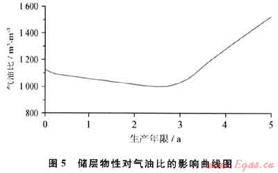 建立前述的理想模型,流體重組分含量隨深度的減小而增大,射孔位置為最底層,模擬氣井的氣油比變化如圖4所示??梢钥闯觯弘S著氣井的開采,氣油比會降低,但隨著反凝析的發(fā)生,氣油比最終會迅速增大。
