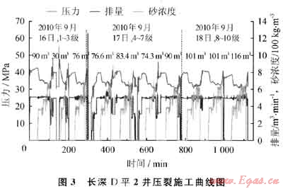 長深D平2井壓裂施工歷時3d,創(chuàng)造了中國石油壓裂史上的3項紀(jì)錄:①水平井深層氣井壓裂級數(shù)最多(10段);②單井總壓裂規(guī)模最大(838m3);③單級壓裂規(guī)模最大(116m3)(圖3)。