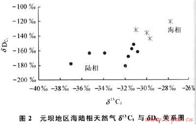 根據(jù)前人對(duì)甲烷氫同位素的研究,通常認(rèn)為烷烴氣的氫同位素首先制約于沉積環(huán)境,其次才是成熟度的影響。Schoell提出天然氣氫同位素組成隨烴源巖熱演化程度的增加變重,陸相淡水環(huán)境生成的熱成因甲烷的氫同位素組成小于-190‰,海相環(huán)境生成的甲烷的氫同位素組成大于-190‰[1]。沈平等研究發(fā)現(xiàn)中國陸相盆地天然氣甲烷的氫同位素組成介于-255‰~-158‰,其中海陸交互相的半咸水環(huán)境中生成的甲烷氫同位素值(δD)亦大于-190‰,而湖相、沼澤相的淡、微咸水環(huán)境生成的生物甲烷δD值一般小于-200‰[2~5]。王曉峰等對(duì)塔里木盆地海相和陸相環(huán)境生成的天然氣甲烷氫同位素進(jìn)行研究后發(fā)現(xiàn),二者基本以-170‰為界[3~6]。錢志浩等認(rèn)為,四川盆地天然氣由于成熟度和共存水的影響,海陸相天然氣甲烷8D的劃分界限以-160‰為宜[6]。