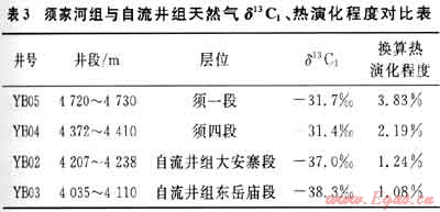總體上,自流井組珍珠沖段、東岳廟段及大安寨段天然氣組分特征與須家河組相比較具有干燥系數(shù)低、重?zé)N含量高的特點(diǎn),且自流井組天然氣甲烷碳同位素值比須家河組更輕,由化驗(yàn)分析結(jié)果結(jié)合地質(zhì)特征,自流井組天然氣熱演化程度比須家河組要低(表3)。例如,YB03井東岳廟段(4035~4110m)天然氣組成中甲烷含量為91.79%,重?zé)N含量為6.257%,干燥系數(shù)C1/C1-5=0.936,屬于偏干的濕氣,相當(dāng)于高成熟階段天然氣。天然氣甲、乙、丙烷系列碳同位素值依次變重,且甲烷碳同位素值相對(duì)較輕,反映原地生成而且具有全捕獲的特征,也即聚集了低演化至目前高成熟階段的全系列天然氣,具有典型原地成藏的天然氣地球化學(xué)特征(表1、2)。