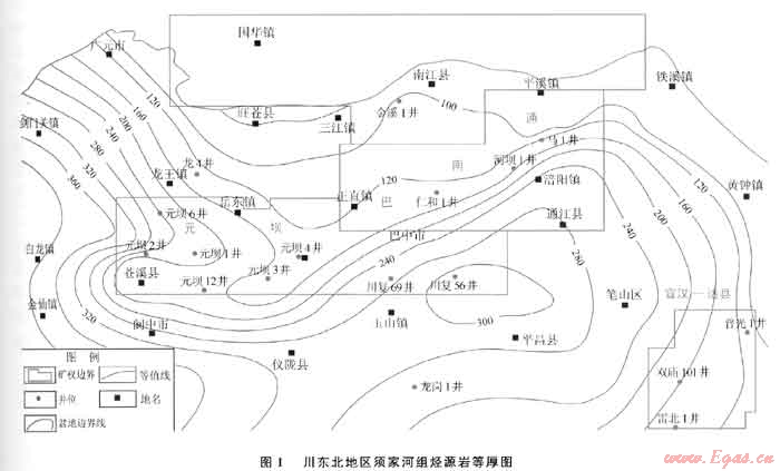 前期研究表明,川東北陸相發(fā)育上三疊統(tǒng)須家河組、下侏羅統(tǒng)自流井組、下侏羅統(tǒng)千佛崖組3套主力烴源巖。其中,須家河組時(shí)期,存在閬中-南部地區(qū)及宣漢達(dá)州西北緣兩個(gè)生烴中心,元壩地區(qū)須家河組烴源巖厚度介于160~220m(圖1);自流井組時(shí)期同樣存在兩個(gè)生烴中心,分別位于元壩-閬中地區(qū)和宣漢-達(dá)州北緣,元壩地區(qū)自流井組烴源巖厚度介于160~260m;而千佛崖組時(shí)期的生烴中心則位于宣漢-達(dá)州地區(qū),元壩地區(qū)該期烴源巖厚度介于120~140m。