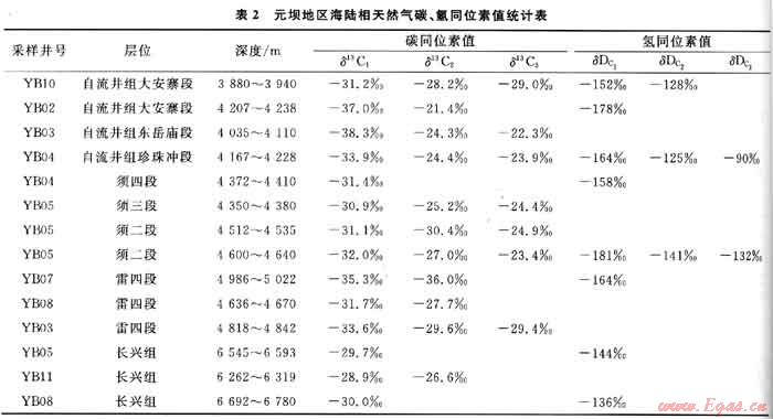 由圖2中可見,元壩地區(qū)海相長(zhǎng)興組及飛仙關(guān)組的4個(gè)樣品點(diǎn)均落在右上角,甲烷氫同位素值(δD)大于-150%o;而雷口坡組及以上陸相地層樣品點(diǎn)則位于左下角,其δD普遍小于-150‰。由于二疊系為海相沉積環(huán)境,海水鹽度高,而陸相多為湖泊、沼澤相的淡水或微咸水沉積環(huán)境,水體鹽度低,加之下伏二疊系熠源巖比上覆陸相烴源巖具有更高的演化程度,因此,該區(qū)海陸相天然氣甲烷氫同位素值應(yīng)該同時(shí)受古沉積環(huán)境和演化程度的影響,結(jié)果導(dǎo)致天然氣的δD存在明顯差異。當(dāng)然,母質(zhì)類型也是影響氫同位素分餾效應(yīng)的因素之一。