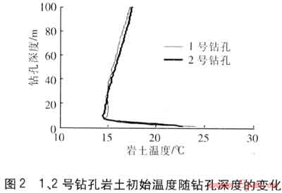 試驗(yàn)儀器安裝完畢后在地埋管內(nèi)充滿水,足夠時(shí)間(一般48h)后,地埋管內(nèi)水與巖土的溫度達(dá)到平衡。將高精度PT100溫度傳感器置于地埋管內(nèi),移動(dòng)測(cè)量100m深度范圍內(nèi)每1m深度水的溫度,測(cè)量水溫即為不同深度巖土的溫度。1號(hào)鉆孔的水流量及加熱功率分別為2.14m3/h、2.01kW,2號(hào)鉆孔分別為2.11m3/h、1.98kW。基于上述方法,在2009年9月測(cè)量1、2號(hào)鉆孔巖土初始溫度隨鉆孔深度的變化,見(jiàn)圖2。由圖2可知,受地表空氣溫度影響,0~10m深度范圍內(nèi)巖土溫度變化較大,1號(hào)鉆孔巖土溫度范圍為14.7~24.0℃,2號(hào)鉆孔巖土溫度范圍為14.4~22.7℃,10m以下深度范圍內(nèi)巖土溫度基本不受地表空氣溫度的影響。總體上巖土溫度隨深度增加而增加,不同鉆孔同一深度巖土溫度變化并不明顯,溫度變化梯度基本一致,說(shuō)明該區(qū)域淺層巖土溫度基本穩(wěn)定。