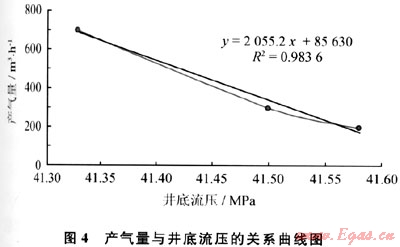 地層壓力是確定欠平衡狀態(tài)的另一個(gè)重要參數(shù)。欠平衡鉆井過(guò)程中,井底處于欠平衡狀態(tài),地層流體在儲(chǔ)層壓力的驅(qū)動(dòng)下流入井筒,其與井筒循環(huán)介質(zhì)混合后,流到地面。不同欠壓值對(duì)應(yīng)不同的地層流體產(chǎn)出量[10~12]。當(dāng)井底流動(dòng)壓力與地層壓力相等時(shí),儲(chǔ)層沒(méi)有流體產(chǎn)出。因此可以實(shí)時(shí)監(jiān)測(cè)地層的產(chǎn)氣量,通過(guò)改變現(xiàn)場(chǎng)的鉆井液排量及注氣量,得到不同井底壓力條件下的穩(wěn)定產(chǎn)氣量,取得3組產(chǎn)氣量與井底循環(huán)當(dāng)量壓力數(shù)據(jù),并繪制于“產(chǎn)氣量 井底動(dòng)壓”坐標(biāo)內(nèi),回歸三點(diǎn)的直線與井底動(dòng)壓坐標(biāo)的交點(diǎn)即地層壓力。