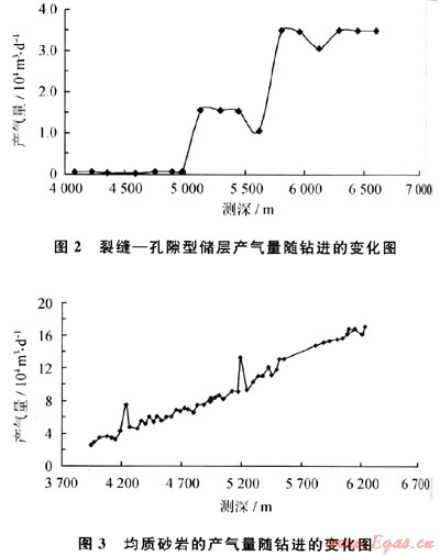 由于鉆遇裂縫和孔隙性基塊會(huì)有不同的產(chǎn)氣量顯示,根據(jù)隨鉆監(jiān)測(cè)的產(chǎn)氣量隨著井深變化特征,可以準(zhǔn)確判斷地層的介質(zhì)類(lèi)型及其供氣能力。圖2為鉆遇裂縫孔隙型儲(chǔ)層時(shí)的產(chǎn)氣隨鉆進(jìn)變化規(guī)律,其氣體產(chǎn)量是隨每鉆遇一個(gè)裂縫(組)而上升一個(gè)臺(tái)階;圖3為鉆遇均質(zhì)砂巖型儲(chǔ)層時(shí)的產(chǎn)氣隨鉆進(jìn)變化規(guī)律,其產(chǎn)氣量與鉆進(jìn)深度幾乎呈直線變化關(guān)系。