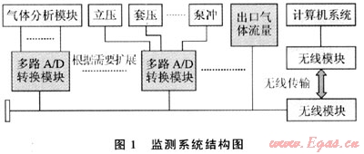 該系統(tǒng)采用分布式信號(hào)采集、集中式數(shù)據(jù)計(jì)算處理體系結(jié)構(gòu),如圖1所示。系統(tǒng)中大部分傳感器都是模擬量信號(hào)輸出,包括氣體組分、濃度、泵沖、立壓、套壓等傳感器,通過(guò)組合式多路A/D轉(zhuǎn)換模塊對(duì)其進(jìn)行遠(yuǎn)程實(shí)時(shí)信號(hào)采集處理和控制。其他以數(shù)字信號(hào)輸出的傳感器則直接連接A/D轉(zhuǎn)換模塊的輸出總線并與主計(jì)算機(jī)系統(tǒng)進(jìn)行數(shù)字化信號(hào)傳輸。A/D轉(zhuǎn)換模塊輸出的總線信號(hào)通過(guò)無(wú)線收發(fā)模塊與主計(jì)算機(jī)系統(tǒng)進(jìn)行無(wú)線傳輸,減輕了在復(fù)雜的井場(chǎng)環(huán)境中布線的工作量。根據(jù)實(shí)際情況,系統(tǒng)可以增加A/D模塊和各種不同類(lèi)型的傳感器來(lái)滿足測(cè)量與監(jiān)控的需要。
