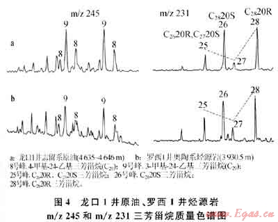 油氣源對(duì)比表明龍口1井志留系原油與羅西1井中奧陶統(tǒng)烴源巖在三芳甾烷的分布上具有相似的特征,如圖4所示。