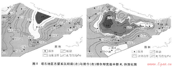 通過(guò)熱演化史分析,塔東地區(qū)卻爾卻克組烴源巖熱演化差異較大(圖5)。