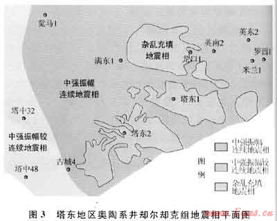 通過(guò)地震標(biāo)定表明,卻爾卻克組深水盆地相沉積以中強(qiáng)振幅、中等連續(xù)地震相為特征,濁積相以雜亂充填地震相為主要特征。地震相追蹤發(fā)現(xiàn)(圖3),東南部的塔東1~塔東2井區(qū)以雜亂充填地震相為主,烴源巖不發(fā)育,與鉆井吻合。東部的米蘭1、羅西1井區(qū)中強(qiáng)振幅、中等連續(xù)地震相發(fā)育,烴源巖厚度大。近期鉆探的古城4井卻爾卻克組為斜坡 盆地沉積[12],缺少濁積砂巖,為中強(qiáng)振幅較連續(xù)地震相,鉆探證實(shí)也有較好的烴源巖發(fā)育。
