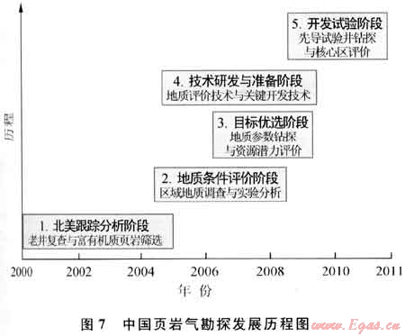 與北美相比,中國頁巖氣勘探起步較晚,而與全球其他地區(qū)相比,中國頁巖氣勘探處于領(lǐng)先地位,為北美以外地區(qū)率先實現(xiàn)頁巖氣突破和工業(yè)化先導試驗的國家。實際上,中國油氣勘探界對于頁巖氣并不陌生。1994—1998年間中國針對頁巖裂縫油氣藏做過大量工作,此后一些學者在個別地區(qū)涉及過頁巖氣的研究。迄今,中國頁巖氣勘探經(jīng)歷了頁巖裂縫性油氣藏勘探、基礎(chǔ)地質(zhì)條件研究與技術(shù)儲備、工業(yè)性突破等3個階段(圖7),邁入工業(yè)化生產(chǎn)先導試驗階段。