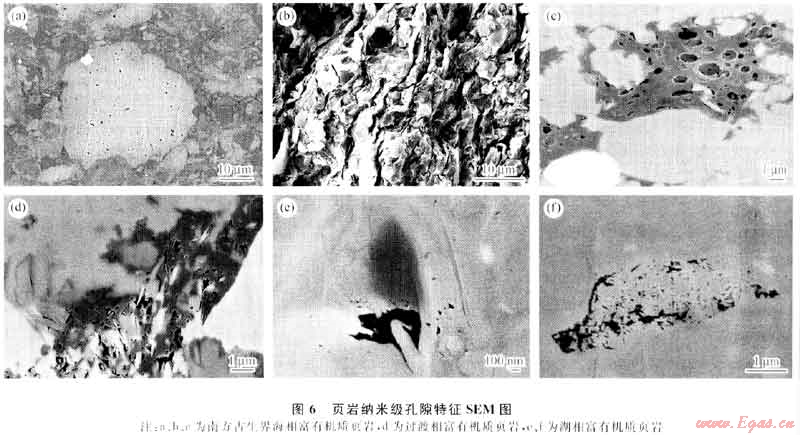 過渡相與煤系富有機質(zhì)頁巖巖性主要為高碳質(zhì)頁巖、碳質(zhì)頁巖、黑色頁巖、粉砂巖、砂巖等,礦物組成宏觀上與海相富有機質(zhì)頁巖元差別,屬脆性礦物含量豐富、黏土礦物含量少的脆性頁巖。四川盆地上三疊統(tǒng)須家河組頁巖石英含量介于33.2%~52.9%,長石含量介于3.0%~20.0%,鄂爾多斯盆地石炭二疊系頁巖石英含量介于32%~54%。在具體構(gòu)成上,過渡相與煤系富有機質(zhì)頁巖礦物組成與海相富有機質(zhì)頁巖還存在較大差異,最為明顯的是黏土礦物構(gòu)成除伊利石為主外,伊蒙}昆層和高嶺石含量比例高,如四川盆地上三疊統(tǒng)頁巖黏土礦物中伊利石含量介于49.4%~78.0%,伊蒙混層含量介于12.7%~22.0%,高嶺石含量介于11.0%~38.0%,綠泥石含量介于11.0%~56.0%。由此產(chǎn)生的影響是過渡相與煤系富有機質(zhì)頁巖儲集空間不發(fā)育、孔滲條件差。儲集空間以原生孔縫為主,納米孔發(fā)育少(圖6),孔隙度介于1.0%~1.3%,平均為1.2%,滲透率介于0.002~0.004mD。