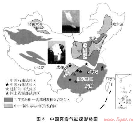 中國政府對中國頁巖氣勘探給予了高度重視。2009年中國與美國簽署了《中美關(guān)于在頁巖氣領(lǐng)域開展合作的諒解備忘錄》,國土資源部設(shè)立了“全國頁巖氣資源潛力調(diào)查評價及有利區(qū)優(yōu)選”重大專項;2010年中國與美國制訂并簽署了《美國國務(wù)院和中國國家能源局關(guān)于中美頁巖氣資源工作行動計劃》、成立了國家能源頁巖氣研發(fā)(實驗)中心;2011年科技部在油氣重大專項中設(shè)立《頁巖氣勘探開發(fā)關(guān)鍵技術(shù)》項目,國家發(fā)展和改革委員會等多部委聯(lián)合編制了中國頁巖氣“十二五”勘探開發(fā)規(guī)劃。目前,中國已在陸上廣泛開展了頁巖氣前期地質(zhì)評價和勘探開發(fā)先導試驗,初步明確了上揚子區(qū)古生界海相富有機質(zhì)頁巖為中國陸上頁巖氣勘探最有利領(lǐng)域。據(jù)不完全統(tǒng)計(圖8),中國已在陸上四川、鄂爾多斯、渤海灣、沁水、泌陽等盆地,云南昭通、貴州大方、建南、銅仁等地區(qū)開展了頁巖氣鉆探與水力壓裂試氣,完鉆頁巖氣井35口(其中水平井5口),水力壓裂試氣井14(氣中水平井2口),獲工業(yè)氣(油)流井11口(其中水平井1口),初產(chǎn)超過1×104m3/d氣井7口。四川盆地、云南昭通實現(xiàn)了古生界海相頁巖氣的突破;四川盆地、鄂爾多斯盆地陸相頁巖氣見到良好顯示;泌陽盆地陸相頁巖油勘探也取得了進展。