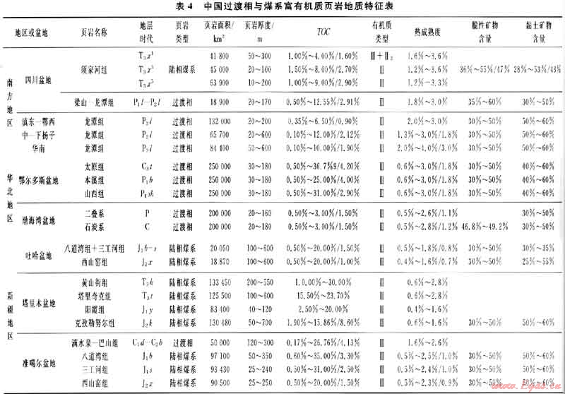 中國過渡相與煤系富有機質(zhì)頁巖發(fā)育程度、分布范圍與海相富有機質(zhì)頁巖相當(表4),其差異在于此類頁巖分布受沉積相帶控制[11],縱橫向變化快,單層厚度小,累計厚度大。華北地區(qū)石炭一二疊系頁巖分布面積介于10×104~20×104km2,累計厚度介于60~200m,最大累計厚度達300m;單層厚度介于8~15m,最大單層厚度達40m。南方地區(qū)二疊系頁巖分布面積介于20×104~50×104km2,累計厚度介于10~125m,最大單層厚度達25m[12]。四川盆地上三疊統(tǒng)、吐哈準噶爾盆地侏羅系和塔里木盆地侏羅-三疊系湖-沼相煤系頁巖面積介于28.165×104~31.150×104km2,累計厚度介于50~1240m,單層厚度介于5~15m,最大單層厚度近50m,縱橫向變化快。