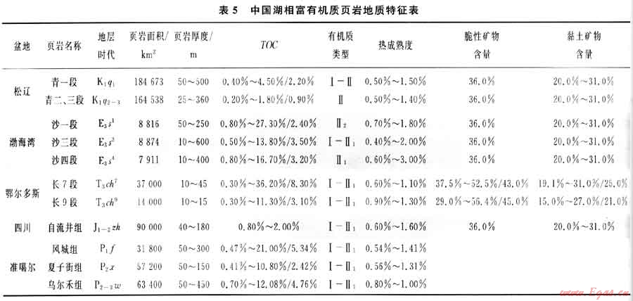 4) 湖相富有機質(zhì)頁巖總厚度大,有機碳含量高,熱成熟度低,頁巖成巖作用低,黏土礦物中水敏礦物含量多,有利區(qū)以盆地中心或埋深較大地區(qū)為主,開采技術(shù)要求高。