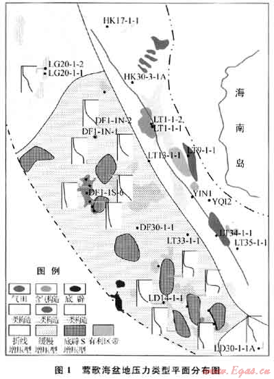 根據(jù)壓力系數(shù)隨深度的變化特征,將鶯歌海盆地地層壓力曲線表征為底辟S增壓型、折線增壓型和緩慢增壓型3種(圖1):①底辟S增壓型——該類型常壓系統(tǒng)與高壓-超高壓系統(tǒng)之間存在較厚的過渡段,隨著深度的增加,在1200~2000m處即可表現(xiàn)為超壓特征,在強超壓帶可見壓力系數(shù)“回頭”現(xiàn)象;②折線增壓型——該類型存在兩個以上的壓力系統(tǒng),在中深部和深部形成不同的壓力系統(tǒng);③緩慢增壓型——主要分布在盆地中央凹陷帶的非底辟區(qū),與盆地快速沉積欠壓實作用有關。