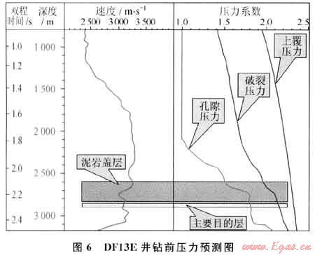 對東方1-1三維地震資料進行精細研究[18~19],在東方氣田西翼發(fā)現(xiàn)黃流組一段大型三角洲體系,落實一群巖性圈閉,經過反復研究和論證,鉆探DF13E井(圖5),該井鉆探目的為探索黃流組一段上部砂體含油氣性和儲量規(guī)模;獲取東方1-1構造西塊中層的儲層物性、油氣層流體性質及產能資料。該井鉆遇的蓋層與DF11C井和DF11D井的明顯不同,該井位于東方底辟構造西側、底辟背斜之外,鉆探結果在黃流組一段上部揭示了一套厚達220m的海侵-高位體系域淺海泥巖蓋層,這套直接蓋層不僅厚度大,而且泥巖純,塑性強(可鉆性差),受壓實程度較高,分布范圍較廣,具有超壓(壓力系數(shù)為1.5~1.8)(圖6),表現(xiàn)出良好的高壓封蓋性能,為異常高壓氣藏的形成提供了重要保障。