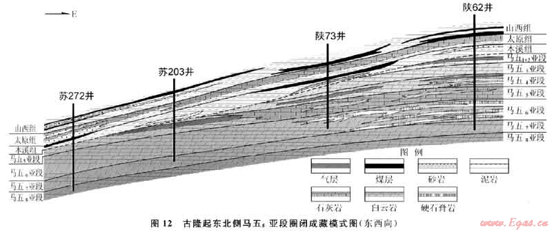構造翻轉后對靖西地區(qū)奧陶系中、下組合的天然氣成藏產生了2個方面的重要影響:①馬五5區(qū)域巖性相變的致密石灰?guī)r一側正處于構造的上傾方向,從而對其西側的白云巖儲集體構成了有效的巖性遮擋條件(圖12);②由于東側上傾,使得上古生界煤系烴源巖層與下古生界白云巖儲層在風化殼界面附近由原來的上下接觸關系變成一定程度的側向(或左右)甚至“源下儲上”的接觸關系,從而更有利于烴類氣體在白云巖儲集體中的充注成藏。