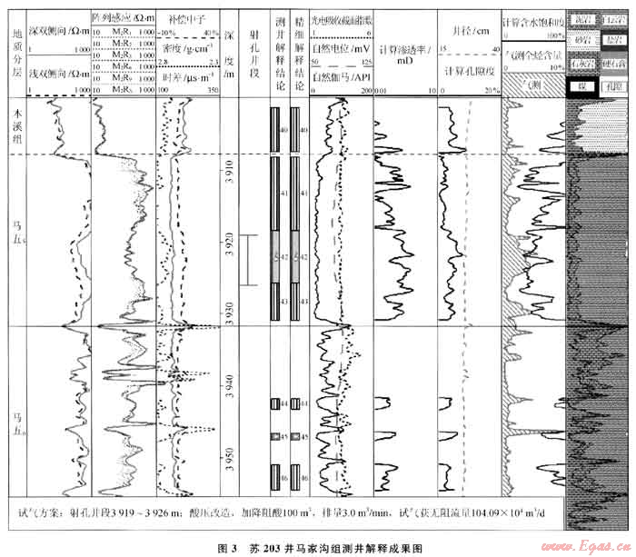 在上述認識的指導下,2009—2010年在蘇里格地區(qū)上古生界砂巖氣藏的勘探中,繼續(xù)堅持兼探下古生界,圍繞古隆起東側的中組合領域終于在蘇203井和蘇322井的鉆探中取得了重大的突破:蘇203井在馬五5鉆遇較好的白云巖晶間孔儲層,含氣顯示良好,測井解釋氣層厚度為7.4m,試氣獲得104.0882×104m3/d的高產氣流(圖3);蘇322井馬五6鉆遇白云巖儲層,測井解釋氣層厚度為3.8m,試氣獲得41.5904×104m3/d的高產氣流。隨后的研究證實,馬五5含氣層段為白云巖晶間孔型儲層,明顯不同于靖邊地區(qū)馬五1+2的風化殼溶孔型儲層,圈閉成藏特征也與靖邊地區(qū)的風化殼氣藏存在較大差異,從而展開了對古隆起東側地區(qū)中組合沉積及成藏規(guī)律的綜合研究,形成了古隆起東側地區(qū)中組合存在區(qū)域性巖性圈閉成藏有利區(qū)帶的新認識,奠定了中組合規(guī)??碧桨l(fā)現(xiàn)的基礎。近期鉆探的蘇345井在馬五5試氣又獲得225.44×104m3/d的高產工業(yè)氣流,目前已落實烏審召、烏審旗、安邊、吳起4個中組合成藏含氣富集區(qū),初步估算天然氣儲量規(guī)模超過1000×108m3。