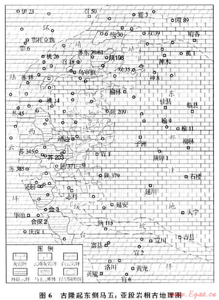 靖邊氣田是發(fā)育在盆地中部奧陶系馬家溝組碳酸鹽巖古風化殼頂部的古地貌圈閉(地層圈閉的一種特殊形式),其主力儲層是馬五1+2風化殼溶孔型儲層,儲層孔隙發(fā)育受含膏云坪沉積相帶及巖溶古地貌的控制極為明顯,圈閉類型主要為巖溶古地貌圈閉[3~7]。該氣田被發(fā)現(xiàn)后,經(jīng)歷了20世紀90年代的快速探明和高效開發(fā)階段,很快躋身我國陸上最大的整裝碳酸鹽巖氣田。進入21世紀以來、圍繞靖邊氣田周邊地區(qū)的天然氣勘探及地質研究工作不斷持續(xù)和深入,在該氣田的東側及西部都相繼取得了較大的研究和勘探進展,探明儲量較20世紀幾近翻番。截至目前,已在盆地中部下古生界探明天然氣地質儲量逾4000×108m3,開發(fā)建成50×108m3的年生產能力,成為向北京、天津及其周邊大中城市供氣的主力氣源。隨著21世紀以來盆地上古生界致密砂巖氣藏勘探的逐步深入,盆地下古生界碳酸鹽巖天然氣勘探能否取得新的更大的突破,成為近期勘探家們亟待回答的問題。