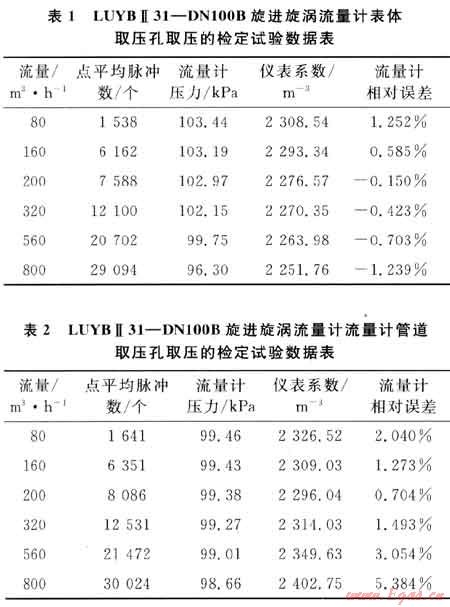 以使用廣泛的LUYBⅡ31—DN1008旋進(jìn)旋渦流量計(jì)為例,系統(tǒng)運(yùn)行時(shí)間為60s,標(biāo)準(zhǔn)裝置的滯止平均溫度為28.9℃,空間平均濕度為30%,流量計(jì)的平均溫度為28.3℃,在表體取壓孔取壓和管道取壓孔取壓的流量計(jì)檢定試驗(yàn)數(shù)據(jù)分別如表1、2所示。