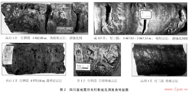 震旦系燈影組下部(燈二段)也有儲層發(fā)育。由于其埋藏較深、含水層較多,以前并未給予足夠重視,對其取得的實物資料較少,研究程度不高。從目前不多的資料來看,它和上部的儲層發(fā)育特征有所差異,主要表現(xiàn)為溶洞規(guī)模降低,孔隙層增多。巖心描述顯示:燈影組向下大型縫洞減少,小型孔洞占據(jù)優(yōu)勢,高科1井燈影組巖心統(tǒng)計,溶洞巖心累計28.57m,其中燈四段11.45m(占40.1%),燈三段12.20m(占42.7%),燈二段4.92m(占17.2%),顯示出向下溶洞發(fā)育減弱。但是在基質(zhì)物性方面,下部儲層有變優(yōu)的趨勢,表明孔隙層增多,借此可以彌補(bǔ)溶洞層減少的不足。