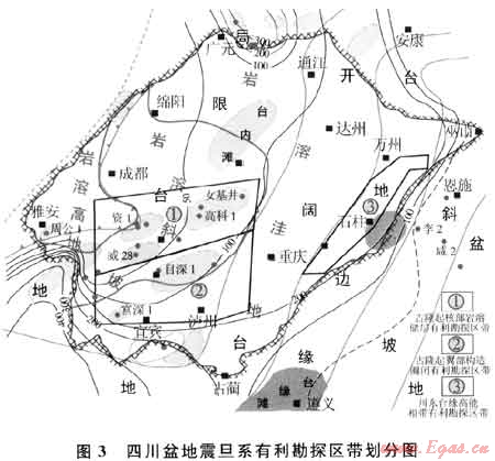 研究表明,震旦系沉積、儲層及油氣演化與富集均受地史時期構(gòu)造運動的影響,主要包括桐灣期、加里東期、印支期、喜山期4期構(gòu)造運動,其中又以加里東運動、喜山運動形成的古隆起、疊隆和現(xiàn)今構(gòu)造意義最為深遠(yuǎn)。通過油氣地質(zhì)條件對比分析,認(rèn)為四川盆地震旦系可劃分3個有利勘探區(qū)帶:古隆起核部巖溶風(fēng)化殼勘探區(qū)帶,古隆起翼部構(gòu)造圈閉有利勘探區(qū)帶,川東臺緣有利勘探區(qū)帶(圖3)。